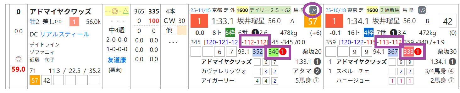 アドマイヤクワッズは上がり最速をマークして2連勝、レースラップのラスト2ハロンが11秒台前半と秀逸、デイリー杯2歳Sでは今回の出走馬の4頭の中で最先着。