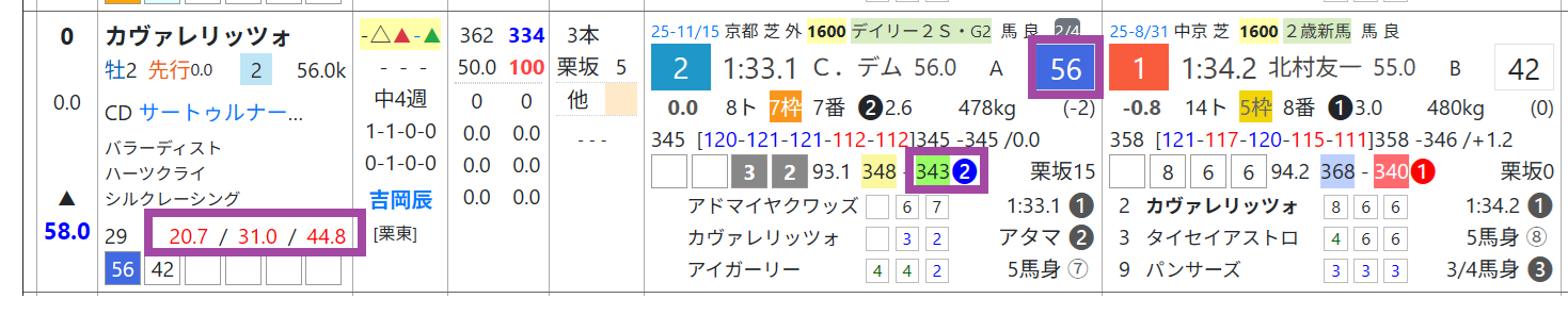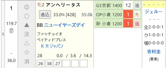 カヴァリレッツォはデイリー杯2歳Sで上がり2位、「ハイブリッド指数」=《56》をマークして2着、吉岡厩舎は阪神の芝の複勝率が複勝率40%超えと優秀。