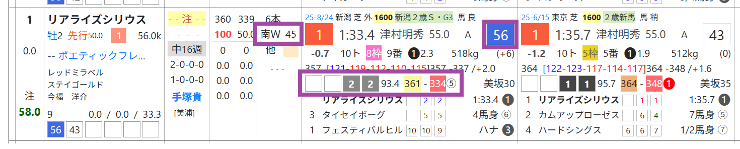 リアライズシリウスは新潟2歳Sで4角2番手→上がり5位、「ハイブリッド指数」=《56》をマークして重賞初制覇、南Wで1週前の「追切指数」=《45》と優秀。