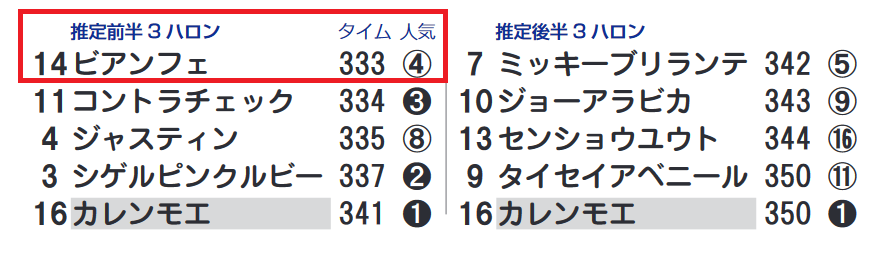 勝ち馬の4頭が「推定前半3ハロン」2~4位。3頭が「推定後半3ハロン」2~4位。