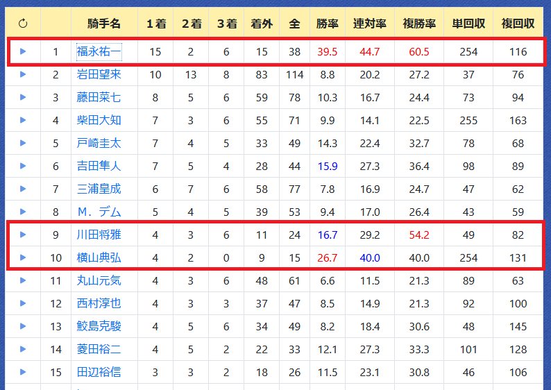 福永騎手が15勝で断トツ、勝率39.5%&複勝率60.5%のハイアベレージ。岩田望来騎手が10勝で2位。川田騎手、横山典弘騎手も複勝率は高い。