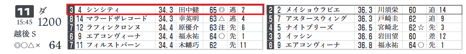 ④シンシテイの前走は前半32.9秒、前傾4.7秒のハイペースを逃げ切り勝ち。