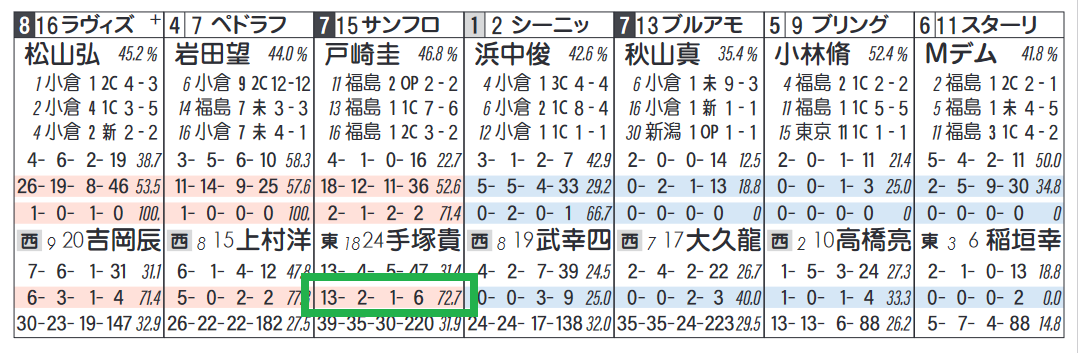 「騎手・厩舎成績(芝・ダ別)」=複勝率72.7%