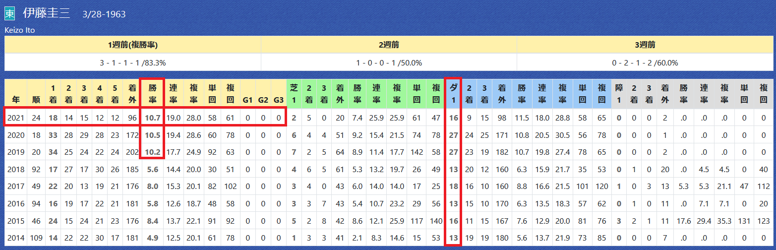 近3年は勝率10%超え。例年、勝ち鞍のほとんどがダート戦。今年も芝2勝に対して、ダート16勝。