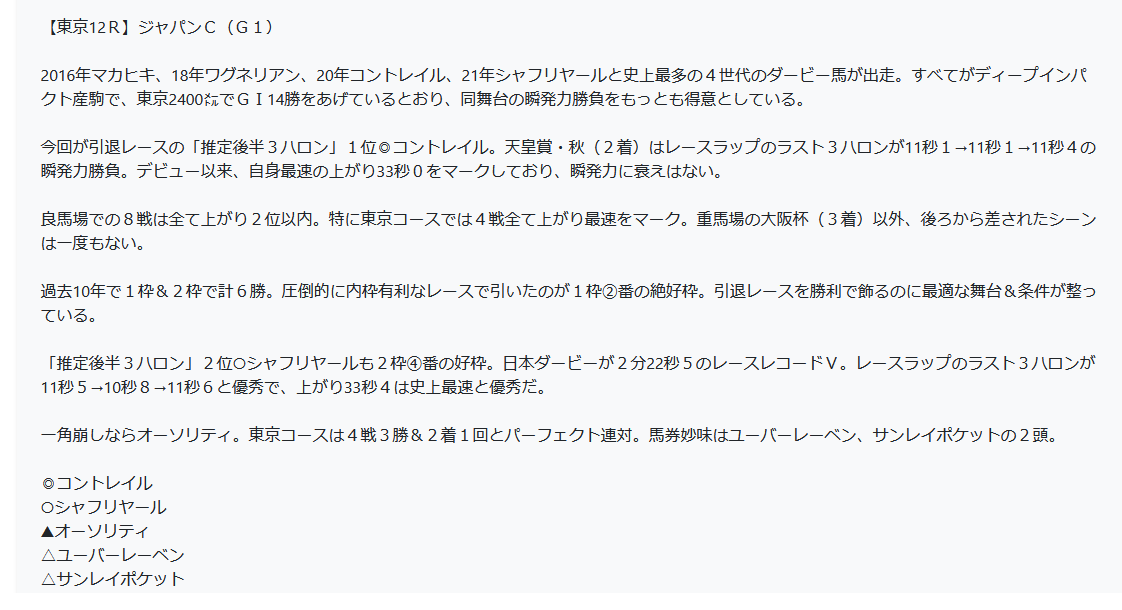 先週のマイルCSは「推定後半3ハロン」2位→1位で決着。とはいえ、単勝&馬単狙いで購入したため、的中したのは抑えの3連複のみ。ジャパンCも買い方がカギとなるはず。