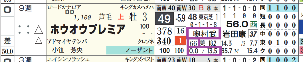「厩舎の該当競馬場の成績」=勝ち数66位、勝率0.0%&複勝率13.5%