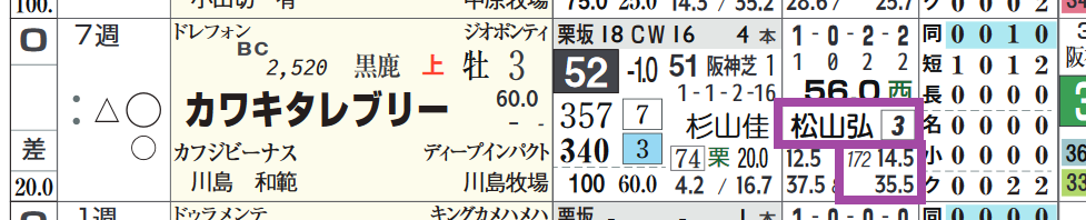 「騎手の該当競馬場の成績」=勝ち数3位、勝率14.5%&複勝率35.5%(172レ-ス)