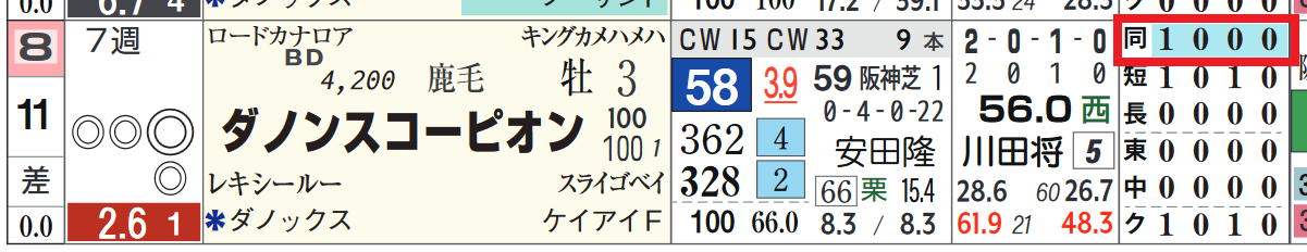「近4開催の厩舎成績」=【4・1・1・8】、「複勝率」=《42.9%》