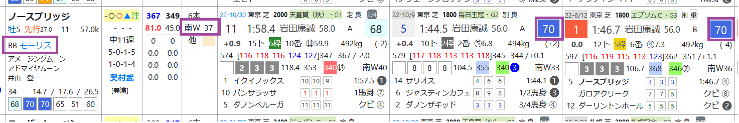 ノースブリッジは3走前&2走前が「ハイブリッド指数」=《70》をマーク、1週前の「追切指数」=《37》と上々、モーリス産駒は中山の芝の中~長距離の成績&回収率が上々。