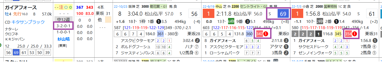 ガイアフォースは6戦3勝&2着2回、セントライト記念が「レースレベル」=《S》&「ハイブリッド指数」=《69》と優秀、3走前&2走前は上がり最速をマーク。