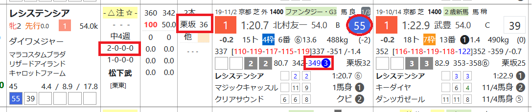 レシステンシアは2戦2勝、ファンタジーSで「ハイブリッド指数」=《56》をマーク、上がりは3位まで、1週前の「追切指数」は《30》超えと上々。