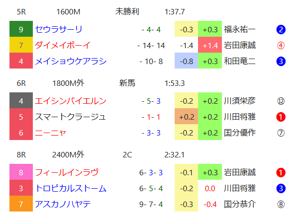 日曜は雨で3場ともに馬場が悪化。小倉8Rは外枠の3頭で決着。7枠&8枠が圧倒。