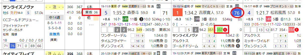 サンライズノヴァはマイルCSで上がり最速をマークして1着、「ハイブリッド指数」=《76》をマーク、1週前の「追切指数」=《30》超えと上々。