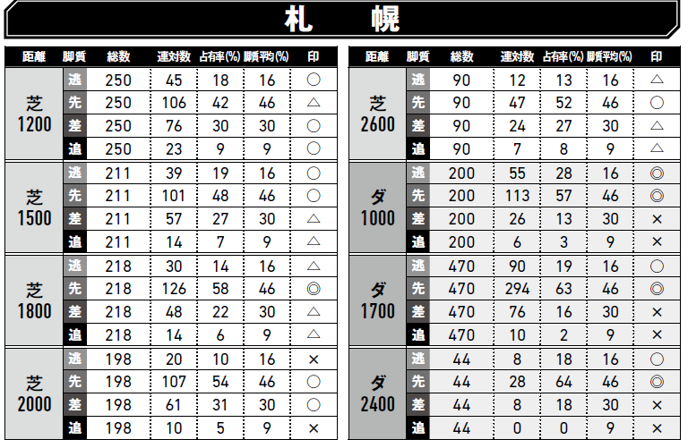 17年アエロリットが1分45秒7のコースレコード。過去5年の前後半3ハロンの平均は35秒6-34秒8、後半の方が0秒8も速い。その結果、勝ち馬はすべて4角7番手以内。その一方、「上がり最速馬」が1勝、2着2回。連対馬の8頭までが上がり4位以内をマーク。小回りコースの割りには上位の上がりも要求されており、今年は函館1800mに替わって傾向が変わるかどうか微妙。近走で大敗している人気薄の一変を警戒しておきたい。
