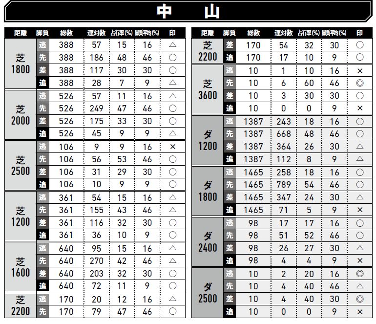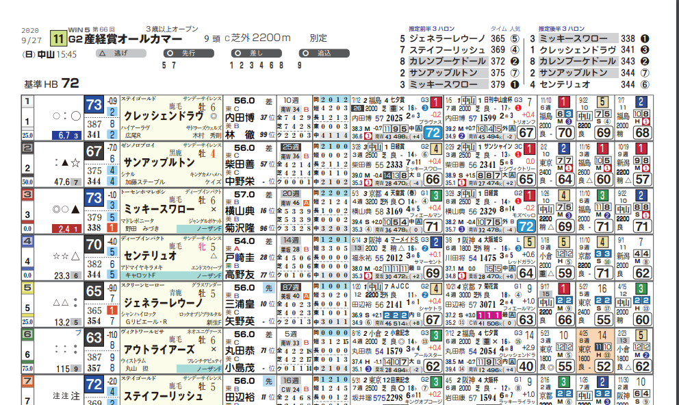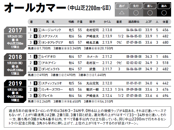 購入1万2000円 払戻2万7700円過去5年の前後半3ハロンの平均は36秒3-34秒9、0秒6以上の後傾ラップが4回ある。それほど速いペースでもないが、「上がり最速馬」は2勝、2着1回、3着1回と好走。連対馬の上がりはすべて33~34秒台と速い。その一方、勝ち馬の3頭が4角4番手以内、すべて8番手以内では立ち回っている。同じ中山2200mで行われるセントライト記念と同様、3角から早めに押し上げて、上位の上がりをマークするのが好走パターン。
