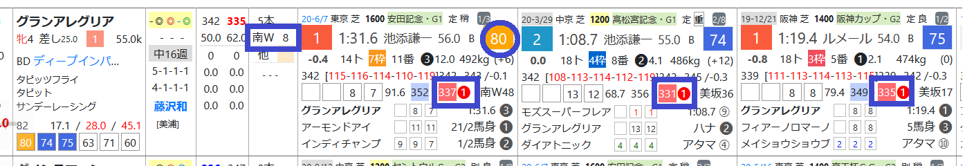 グランアレグリアは安田記念で「ハイブリッド指数」=《80》をマーク、近3走すべて上がり最速33秒台をマーク、休み明けで1週前の「追切指数」が《8》と低いのがどうか。