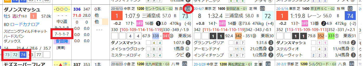 ダノンスマッシュはオープンで7勝、近3走すべて「ハイブリッド指数」=《70》超えをマーク、セントウルSで今回の出走馬の8頭の中で最先着。