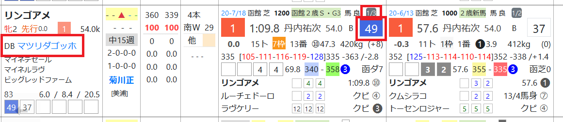 リンゴアメは函館2歳Sで「ハイブリッド指数」=《49》をマーク、今回の出走馬の3頭の中では最先着、マツリダゴッホ産駒は東京の芝の短距離~マイルの成績が微妙。