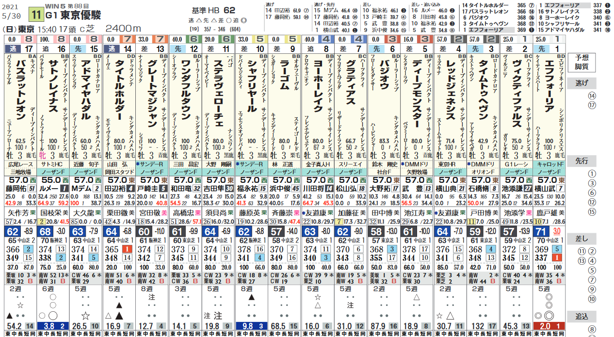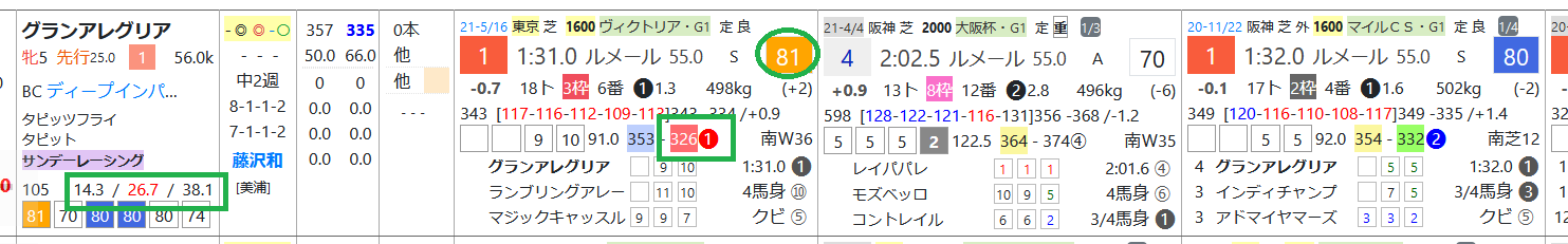 グランアレグリアはヴィクトリアMで上がり最速をマーク、「ハイブリッド指数」=《81》と秀逸、藤沢和雄厩舎はオープン&重賞で勝率14.3%&複勝率38.1%と優秀。