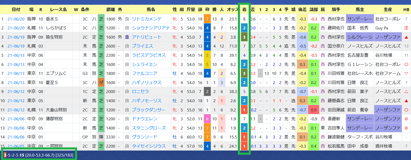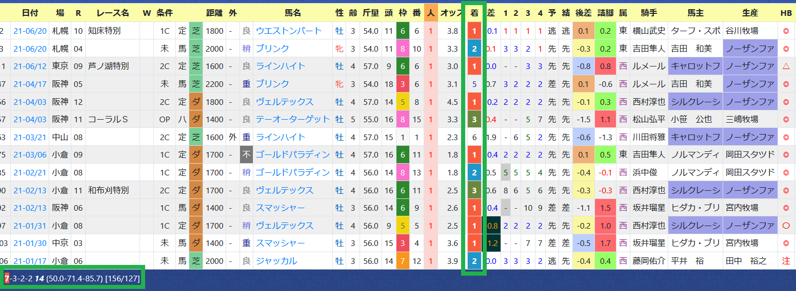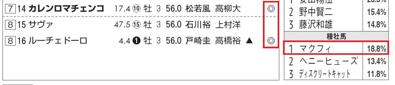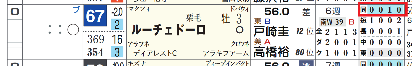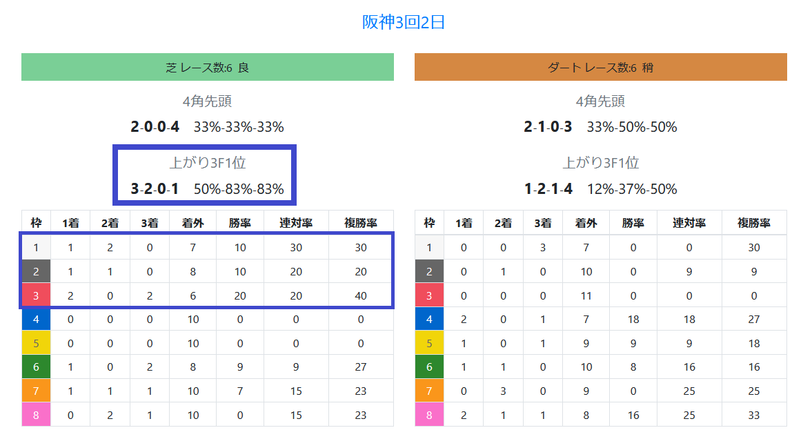 「上がり最速馬」が6レースで5連対。1~3枠が計4勝、勝率~複勝率は内枠が優勢。