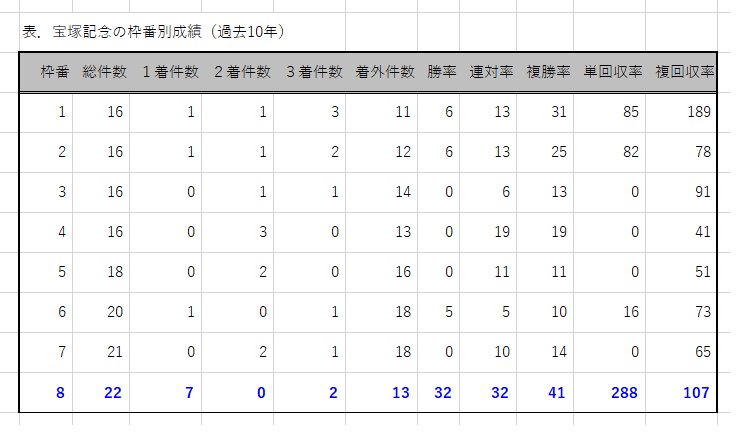 昨年は8枠⑯クロノジェネシスが6馬身差V。2着が7枠⑭キセキ、3着が6枠⑫モズベッロの外枠決着。8枠が7勝、単勝回収率&複勝回収率100%超えと圧倒している。