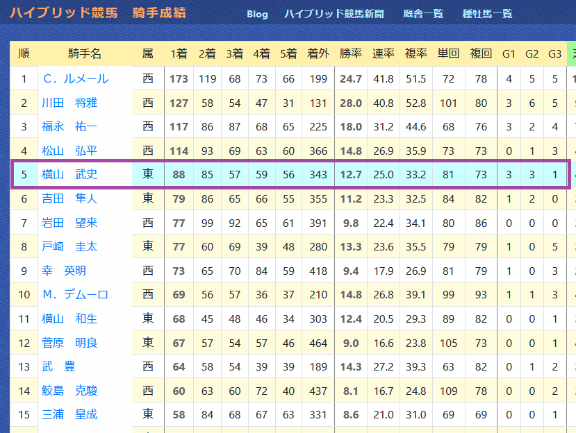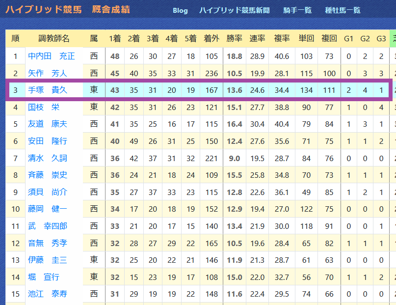 →「HBビューワ」→「厩舎成績」リーディング5位。