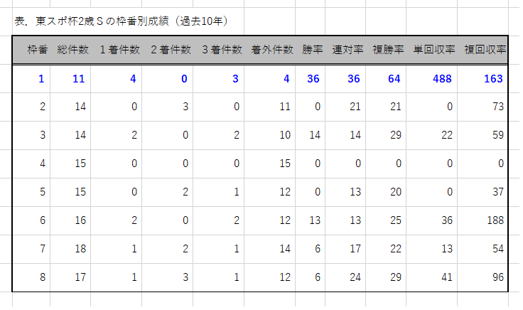 1枠が最多の4勝、勝率~連対率まで断トツ。外枠が不利という訳ではないが、1枠が圧倒的に成績がよい。