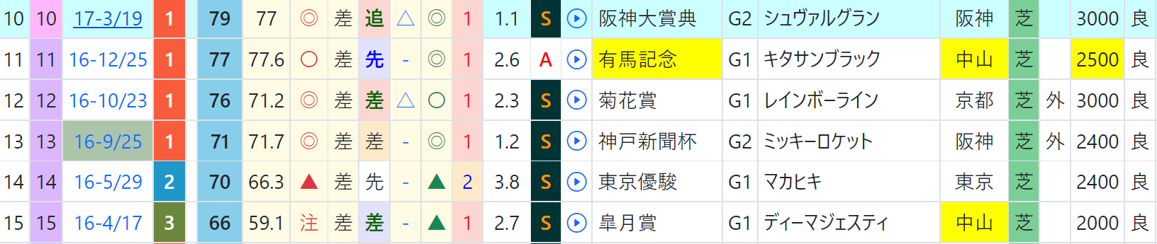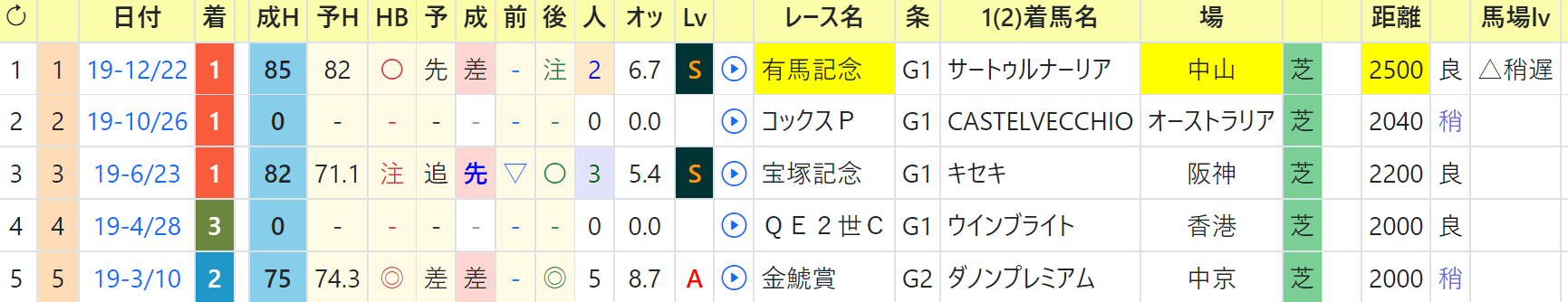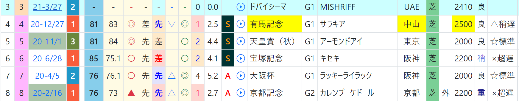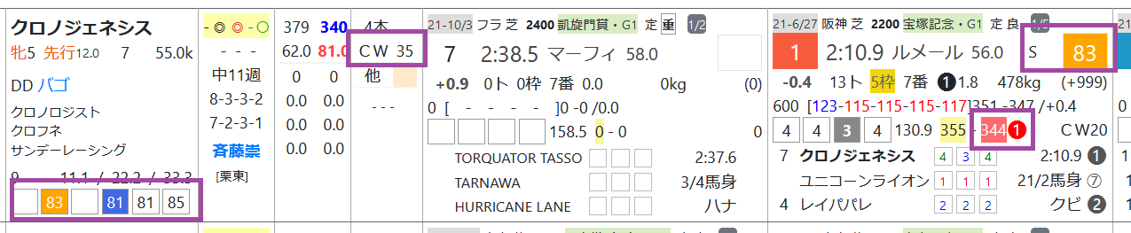クロノジェネシスは国内の近4走が「ハイブリッド指数」=《80》超え、宝塚記念で上がり最速をマーク、1週前の「追切指数」=《35》と上々。