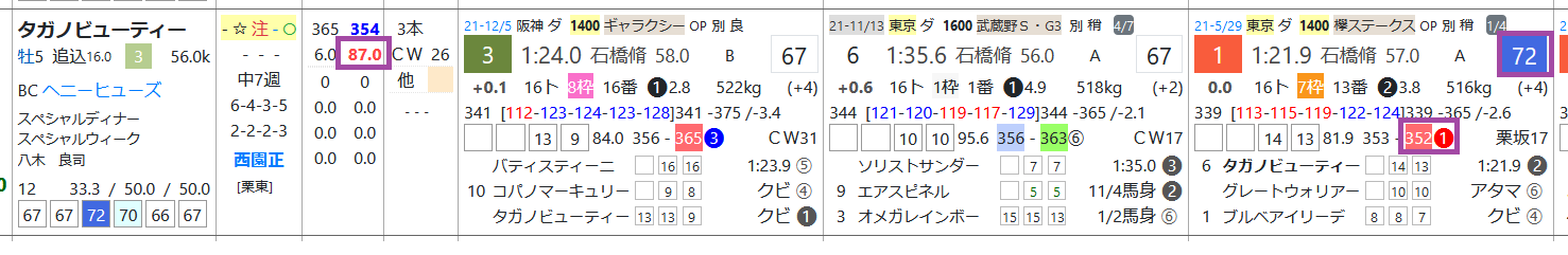 タガノビューティーは欅Sで上がり最速をマーク、「ハイブリッド指数」=《72》をマーク、「上がり3位内率」=《87%》とラストは堅実。