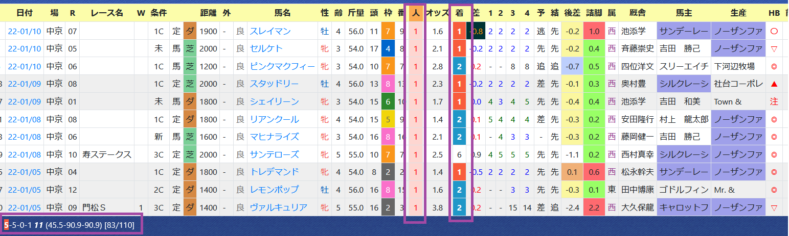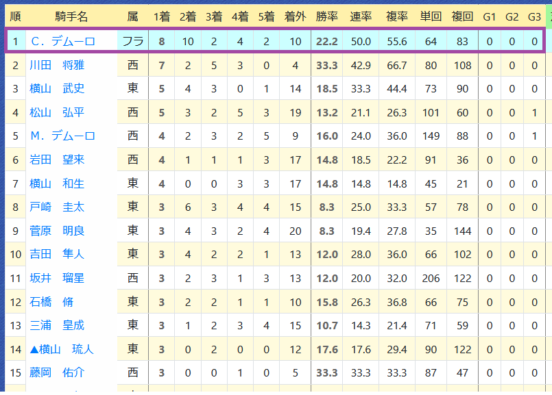 「騎手の該当競馬場の成績」=勝ち数2位、勝率15.6%&複勝率34.8%(135レース)