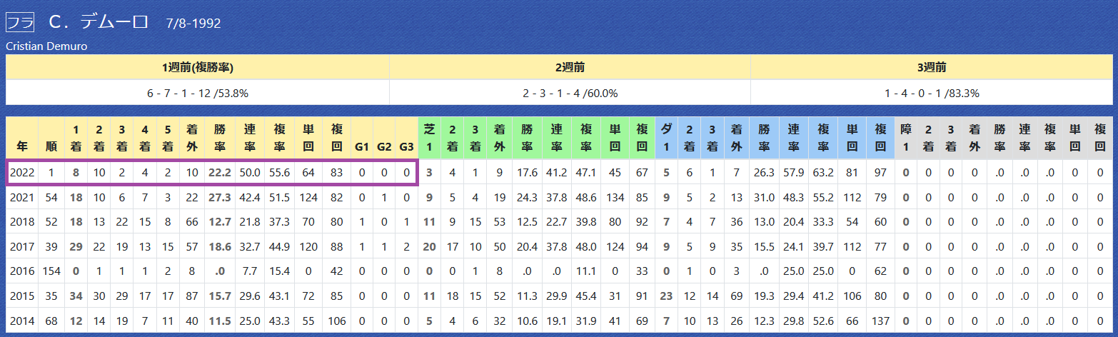 M.デムーロ騎手とのコンビで複勝率40%超えと好成績。