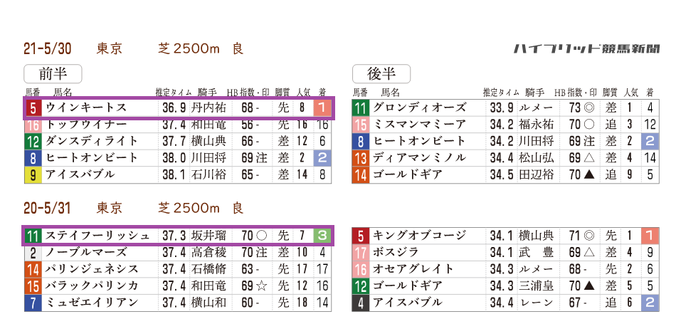 昨年は「推定前半3ハロン」1位→4位がワン・ツー。近2年は「推定前半3ハロン」1位が3着以内。