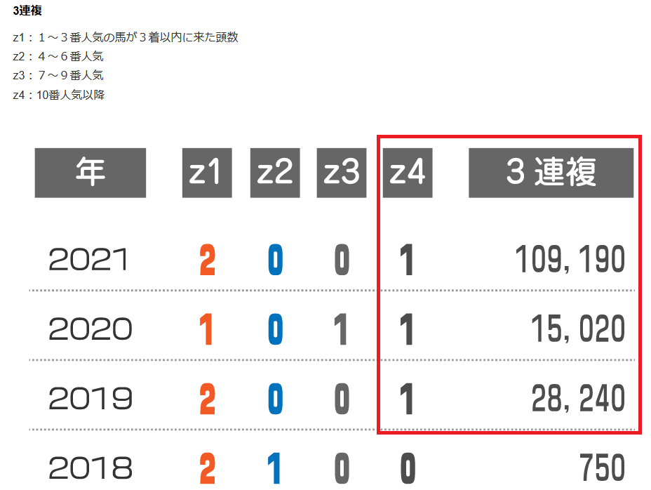 近3年は10人気以下が馬券絡み。3連複万馬券の大荒れ。