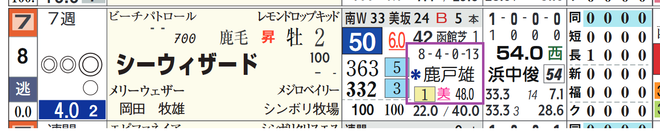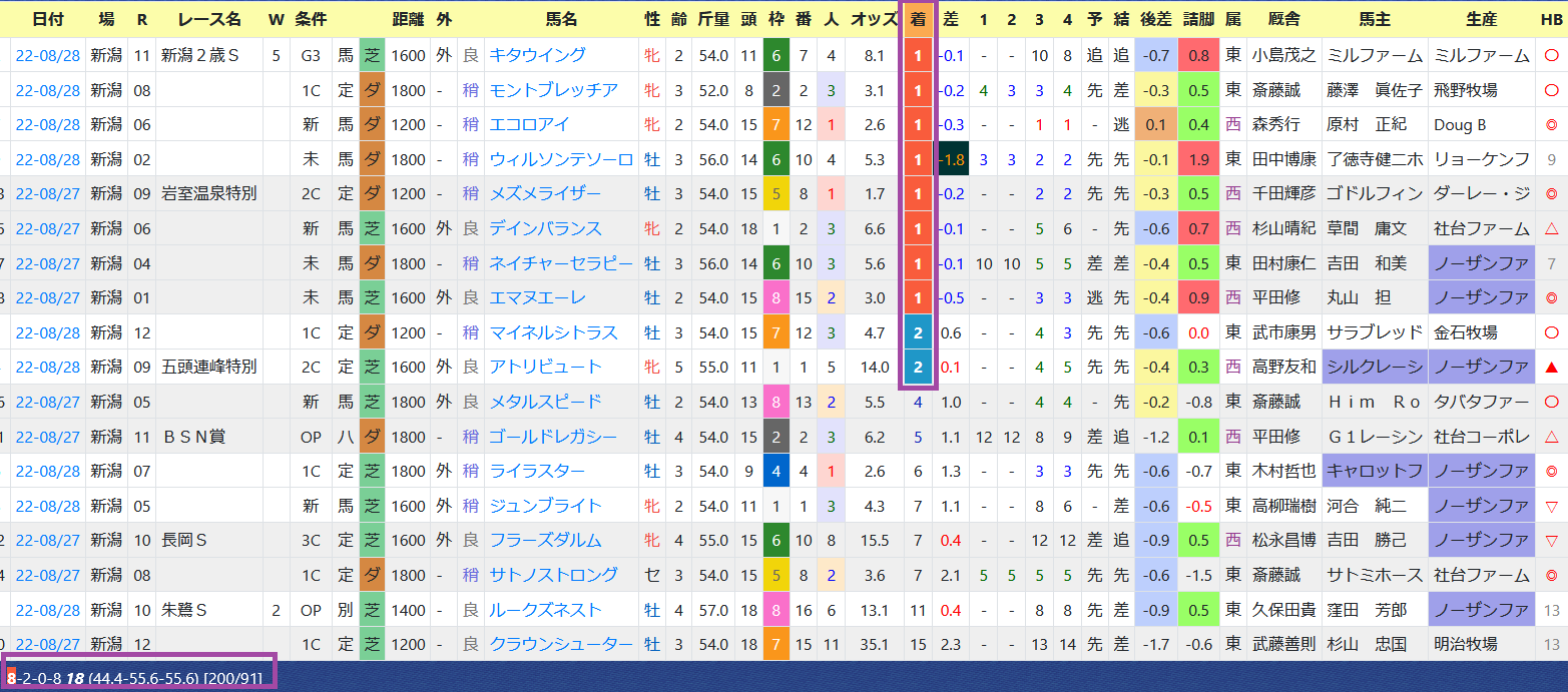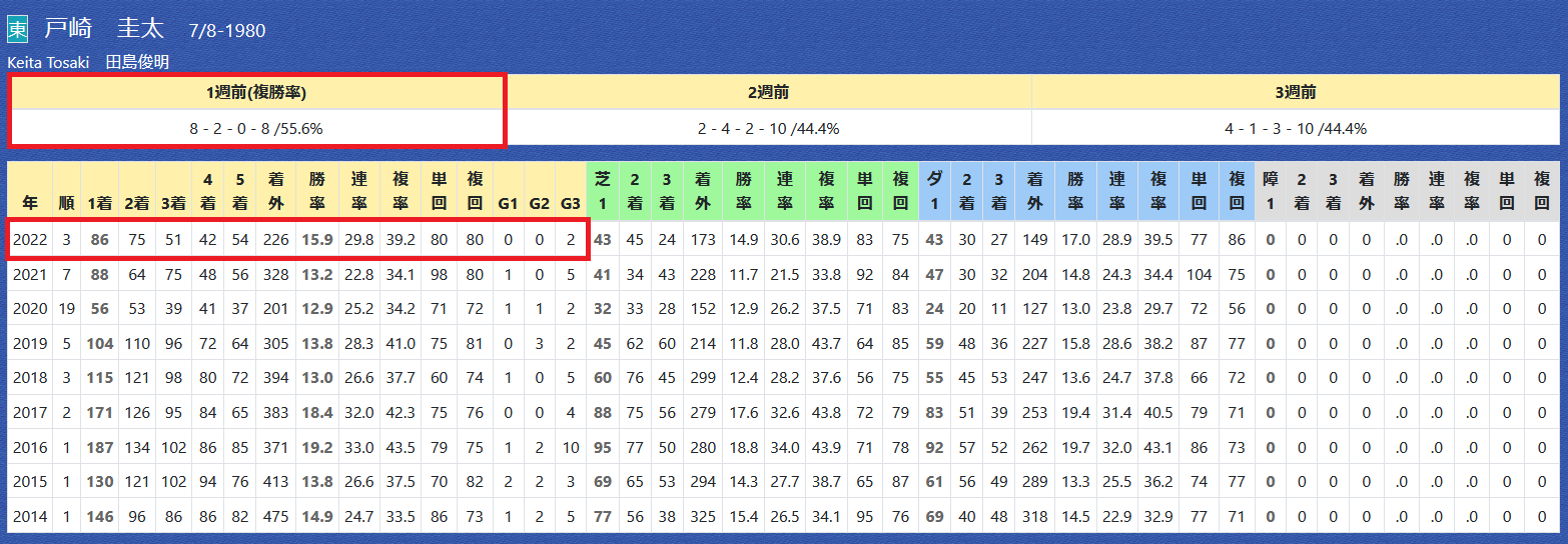 「厩舎の該当競馬場の成績」=勝ち数1位、勝率22.0%&複勝率40.0%