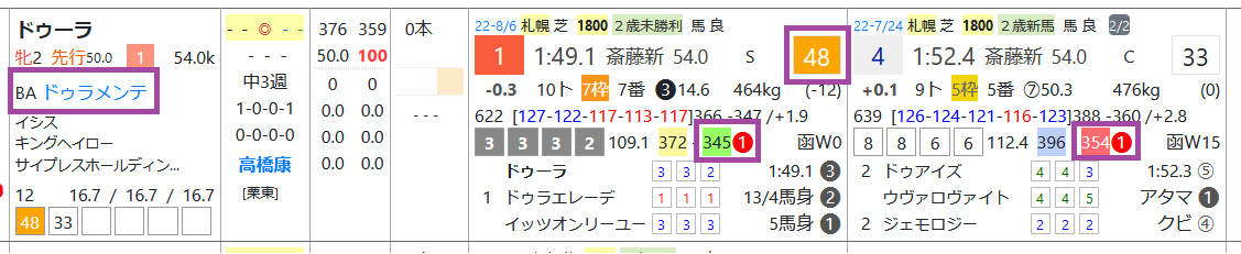 ドゥーラは2戦ともに上がり最速をマーク、前走が「ハイブリッド指数」=《48》と優秀、ドゥラメンテ産駒は札幌の芝の中~長距離の成績&回収率が上々。