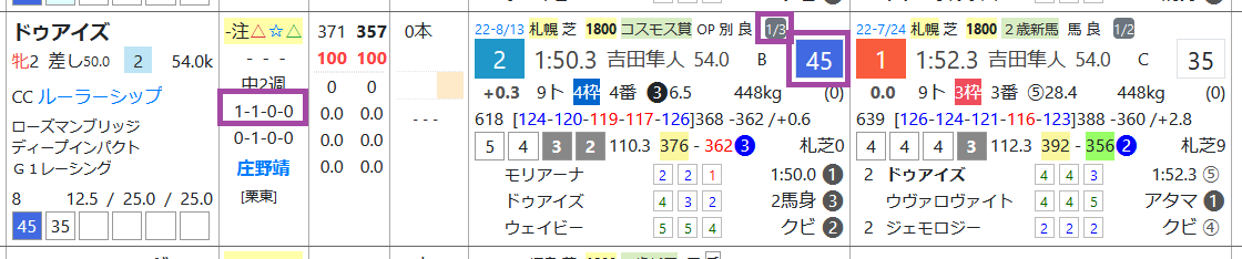 ドゥアイズは2戦1勝&2着1回、コスモス賞で「ハイブリッド指数」=《45》をマーク、今回の出走馬の3頭の中では最先着。