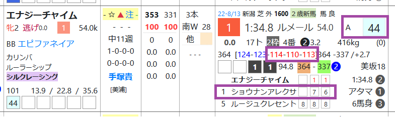エナジーチャイムは新馬戦で「ハイブリッド指数」=《44》をマーク、レースラップのラスト3ハロンが11秒4-11秒0-11秒3と優秀、2着馬も次走で勝ち上がり。