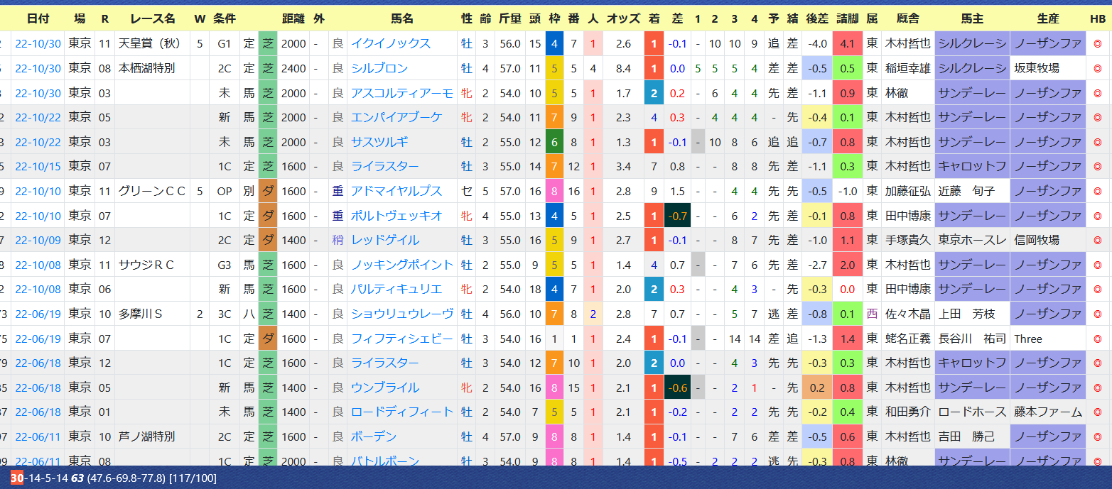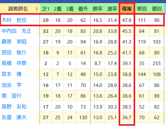 「インスタグラム」「ツイッター」に書いた通り、木村厩舎は芝の複勝率47.9%で全厩舎でトップ。