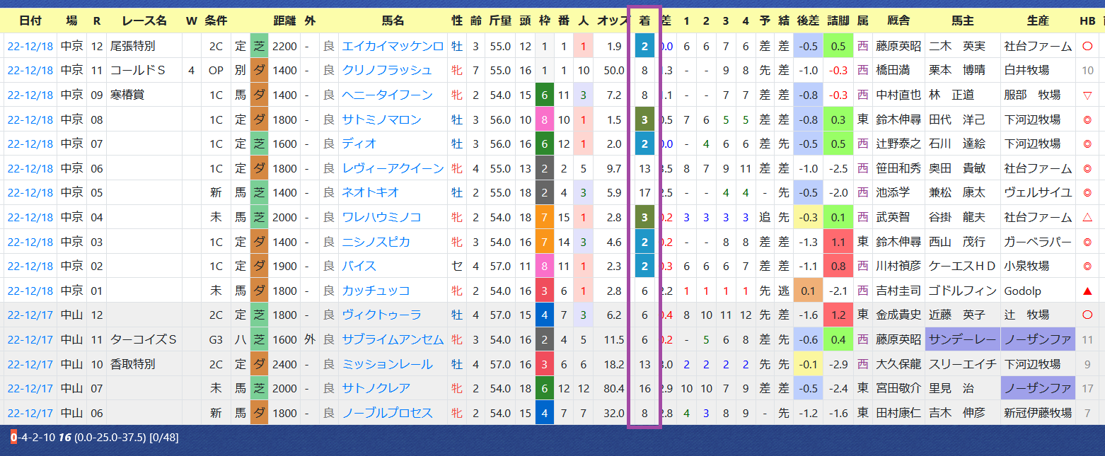 2022年12月21日 【データ分析】宮本博厩舎 【宮本博厩舎】近2年は芝の複勝率30%超え。今年は単勝回収率&複勝回収率100%超えと優秀。年度別成績有馬記念にはボルトグフーシュが参戦。芝2200m以上は複勝率48%のハイアベレージ。芝2200m以上の成績→トップページからログイン→「HBビューワ」→「厩舎成績」※会員登録(無料)で利用可能⇒「インスタグラム」「ツイッター」にて他情報も更新中