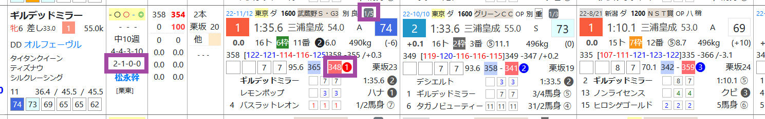 ギルデッドミラーはダートで3戦2勝&2着1回とパーフェクト連対、武蔵野Sで上がり最速をマークしてV、今回の出走馬の5頭の中で最先着。