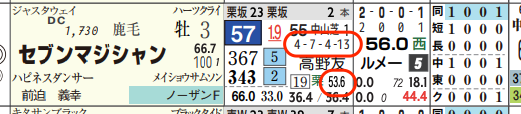 「近4開催の厩舎成績」=【4・7・4・13】、「複勝率」=《53.6%》