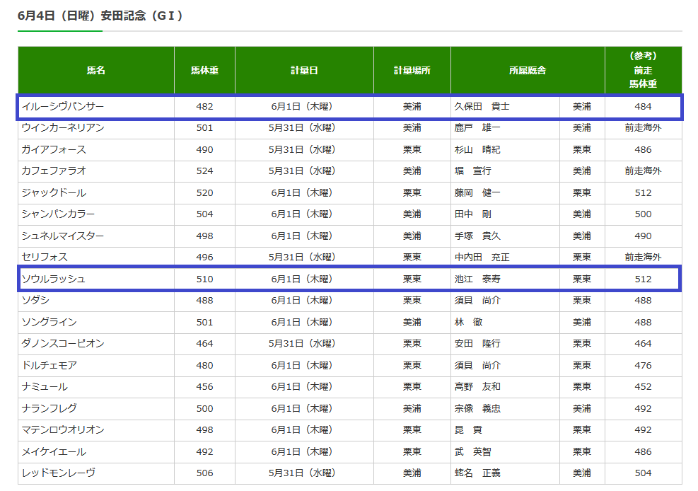 2023年06月01日 【データ分析】安田記念の調教後の馬体重 【安田記念の調教後の馬体重】ソウルラッシュが大幅馬体増の前走から絞ってきた感。イルーシヴパンサーも調教を積んでメイチの仕上げか。⇒「インスタグラム」「ツイッター」にて他情報も更新中