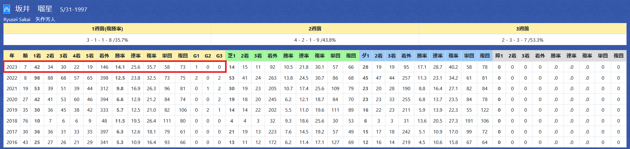 2023年06月01日 【データ分析】坂井瑠星騎手 【坂井瑠星騎手】先週は3勝。先週の成績今年は自身最高の7勝と好調。初の100勝超えも可能か。→トップページからログイン→「HBビューワ」→「騎手成績」※会員登録(無料)で利用可能⇒「インスタグラム」「ツイッター」にて他情報も更新中