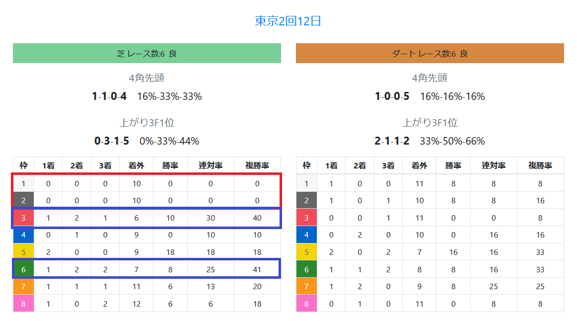 2023年06月01日 【データ分析】東京競馬場の芝の馬場傾向 【東京競馬場の芝の馬場傾向(先週の日曜)】1枠&2枠は3着以内がゼロ。3枠&6枠が複勝率40%超え。中枠が優勢。枠番別成績→トップページからログイン→「HBビューワ」→「当週馬場傾向」※会員登録(無料)で利用可能⇒「インスタグラム」「ツイッター」にて他情報も更新中