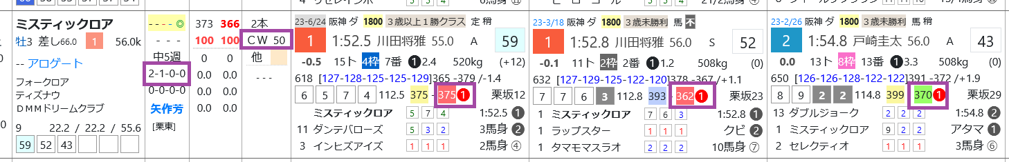 ミスティックロアは3戦すべて上がり最速をマーク、2勝&2着1回とパーフェクト連対、1週前の「追切指数」=《50》と秀逸。