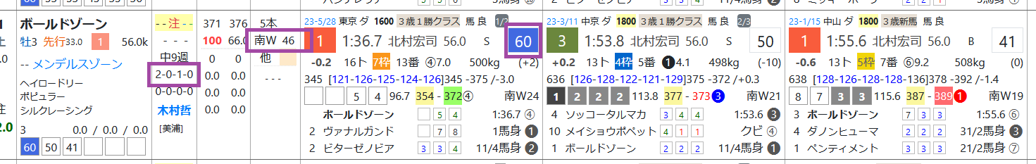 ボールドゾーンは3戦2勝&3着1回、前走の1勝クラスで「ハイブリッド指数」=《60》をマーク、1週前の「追切指数」=《46》と優秀。