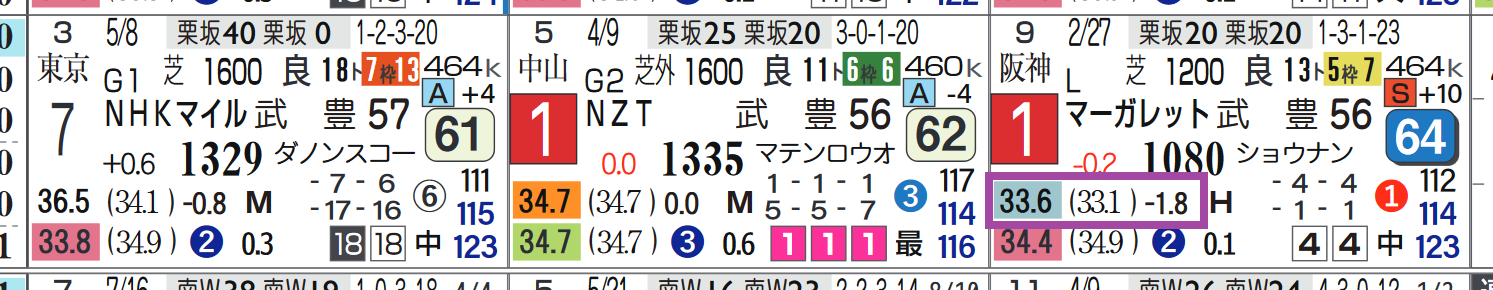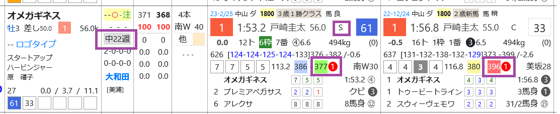 オメガギネスは2走ともに上がり最速をマーク、前走の1勝クラスが「レースレベル」=《S》とハイレベル、中22週のローテーションがポイント。