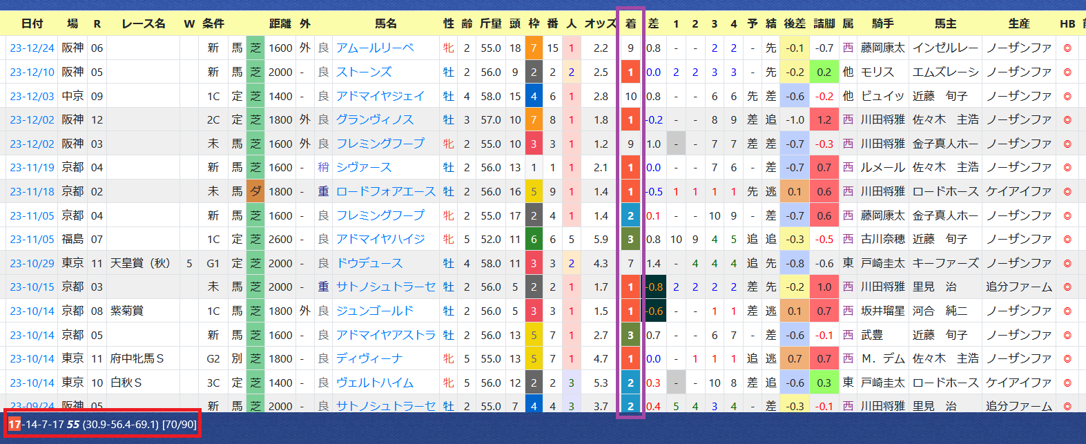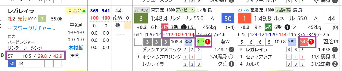 レガレイラは2戦ともに上がり最速をマーク、レースラップのラスト3ハロンすべて11秒0前後と秀逸、木村厩舎は中山の複勝率40%超え。