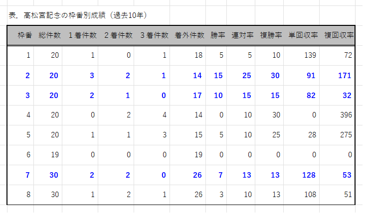 「インスタグラム」「ツイッター」に書いた通り、2枠が最多の3勝、勝率~複勝率すべてトップ。3枠&7枠が2勝ずつ。内枠の方が勝率が高い。