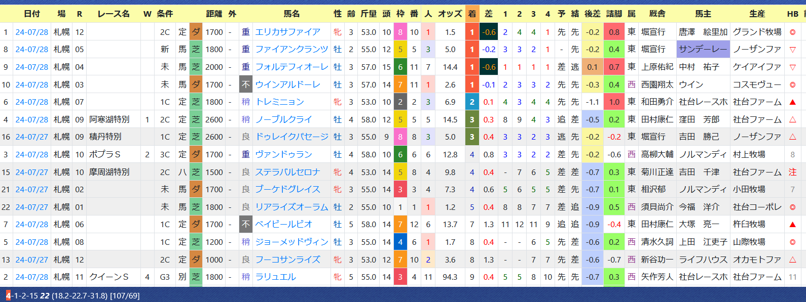 「近4開催の厩舎成績」=【3・4・0・6】、「複勝率」=《53.8%》